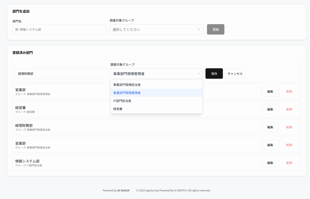 ヒアリング対象(主にそのシステムを利用している)部門と役割(事業部門現場担当者/現場管理者/IT部門担当者/経営層)の紐づけを事前にセットすることで、役割に応じたヒアリング項目が予めセットされます。