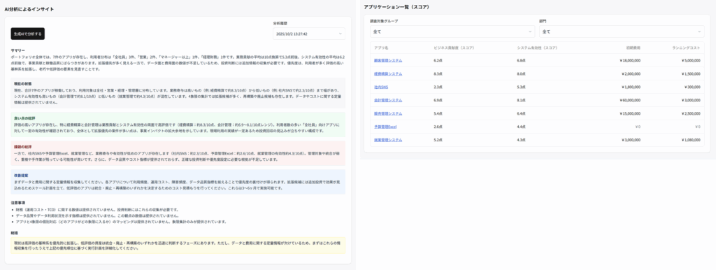 • ビジネス貢献度評価:アプリケーションが売上向上、コスト削減、業務効率化などにどれだけ貢献しているかを分析します。