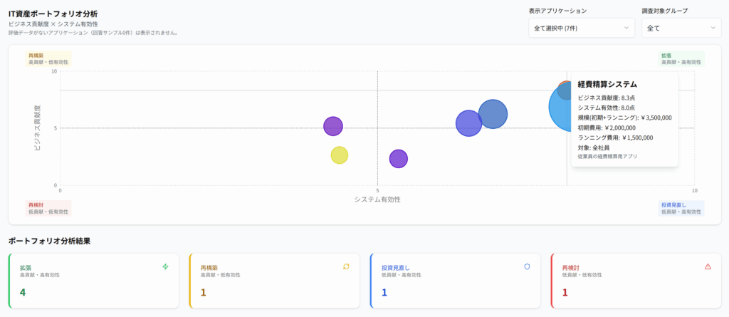 収集されたアンケート回答を元に各アプリケーションの状態を4象限でプロットします。