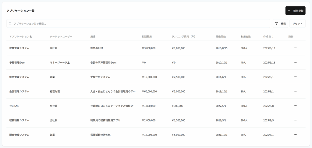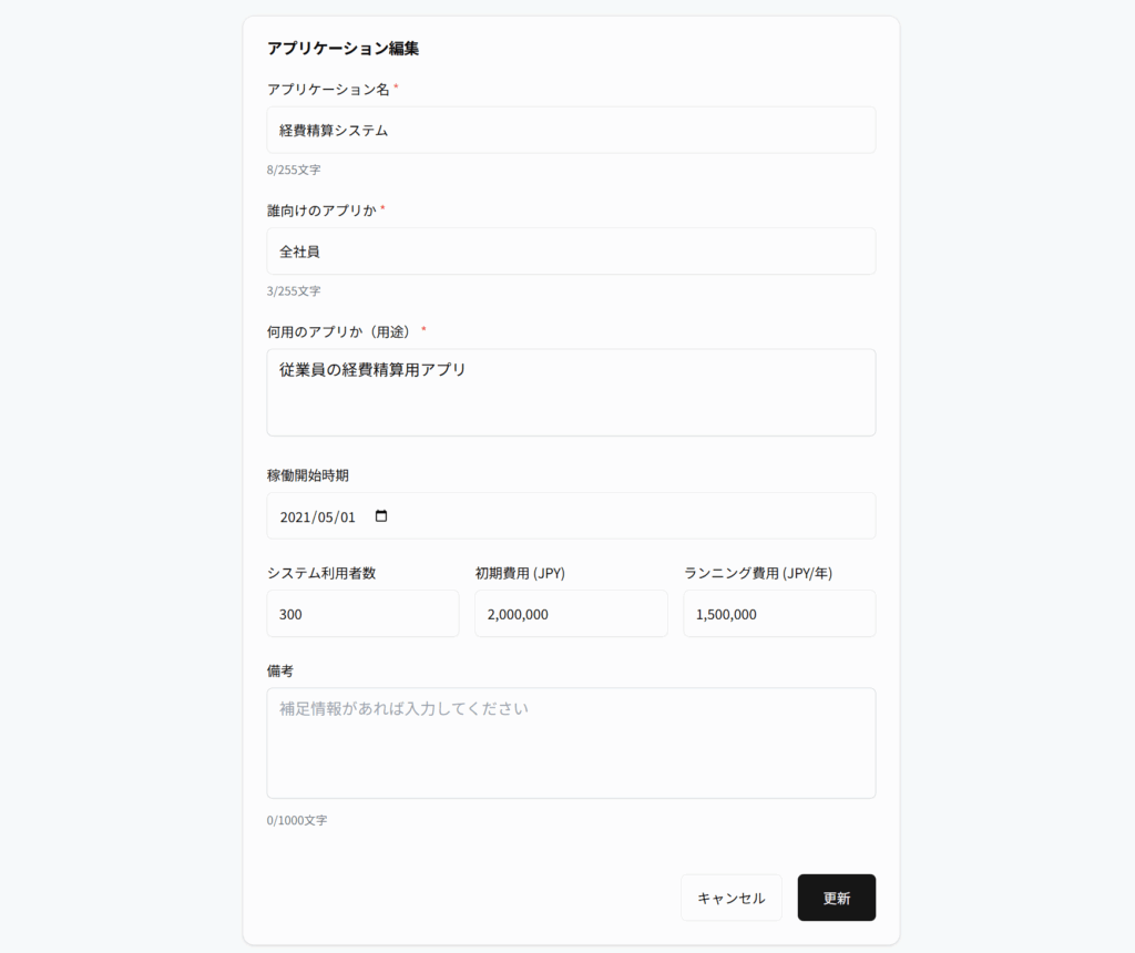 アプリケーションの利用用途や費用・利用者数等を登録します。棚卸としても活用することができます。